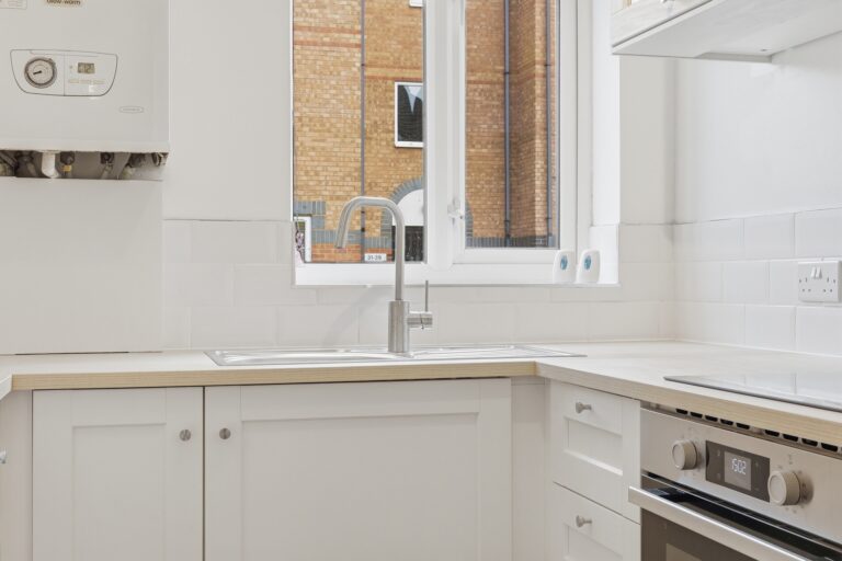 The separate fitted kitchen (approx. 2.48m x 2.55m) provides a functional arrangement with work surfaces, storage units and space for appliances.